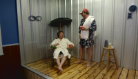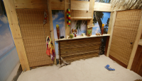 This weekend, we’re creating a cozy winter-themed retreat with our hot tub ski chalet. We’ll start by insetting our portable hot tub into a hole in the base of our old skateboard half-pipe. A circular tabletop lid made from a series of 1-by-4 strips stained a variety of colours, atop a shroud of curved plywood, will hide the hot tub within a stylish oversized coffee table. We’ll use the hot tub’s original inflatable lid along with some styrofoam billets to give the table top a floating, lazy-susan effect, so that we can easily pass around our hot chocolate cocktails and comfort food fondue before popping the lid to reveal the surprise of our hot tub centrepiece. Plush daybeds built into the hills of our old halfpipe will combine with our wood-mantled fireplace, ski tip chandelier and snowshoe wall sconces to complete a soothing after-ski experience — the perfect place to relax and reminisce after a great day on the slopes.