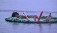 The guys decide paddling is just too much, so they build a propeller into a paddle and power the whole thing with a cordless drill.